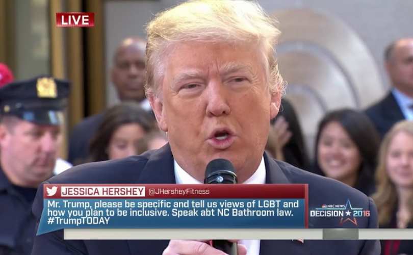 Earlier today in an NBC interview, Trump said in response to North Carolina’s Bathroom Law, “Transgender people should be able to use WHATEVER bathroom they want.. North Carolina did something that was very strong. And they’re paying a big price. There’s a lot of problems.. We should just leave it the way it is right now.. Leave it the way it is. North Carolina, what they’re going through with all the business that’s leaving, all of the strife, and this is on both sides. Leave it the way it is.” By saying leave it the way it is, he’s endorsing grown men who identify as “women” to enter women’s restrooms. The North Carolina Law was passed to ban transgender individuals from using a bathroom that does not match their gender at birth. It is a “common-sense” law meant to protect women and children from predators.