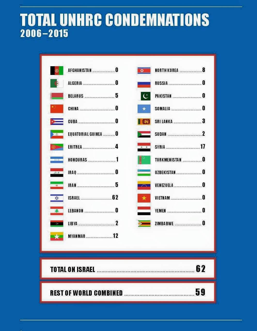 The General Assembly’s 2015 session adopted 20 resolutions singling out Israel, and only THREE resolutions on the rest of the world combined. The 3 were comprised of ONE against Syria (a regime that murdered more than 200,000 of its own people), just ONE against Iran, and a measly ONE against North Korea. So 20 resolutions condemning the Middle East’s only democracy, and just one-a-piece for 3 of the world’s most brutal, murderous and dangerous regimes. In the past decade, Israel has been condemned by the UNHRC over 60 times. More than ALL other Nations COMBINED. Think about that and let it sink in. In the same period, the UN condemned Syria less than 20 times, Iran only 5 times, North Korea less than 10 times, and Russia, Saudi Arabia, Cuba, and China, a whopping 0 times. ZERO!!!