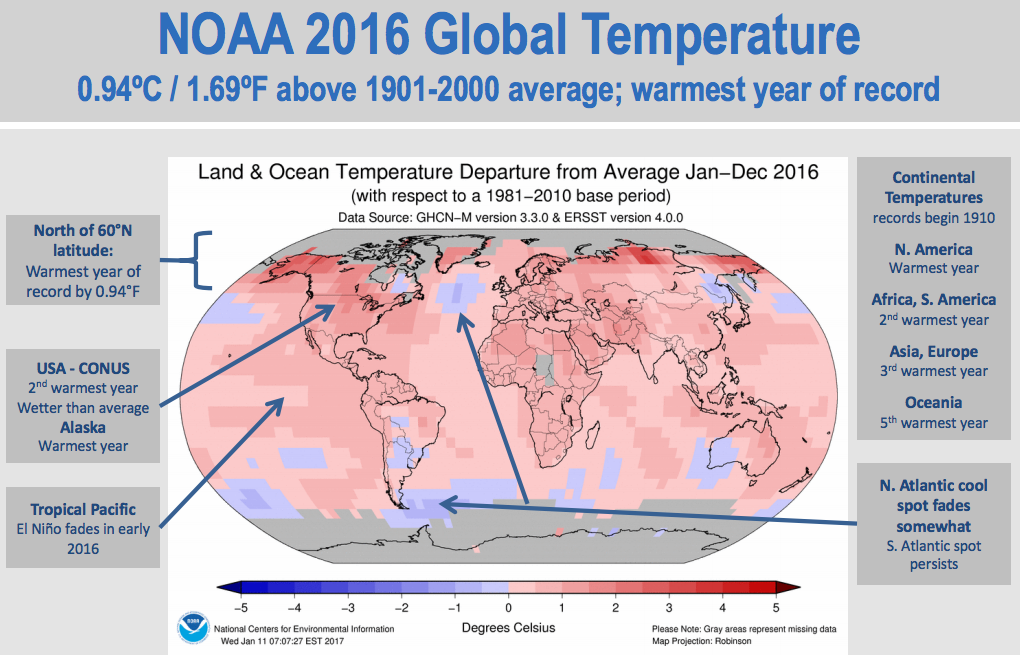 Temperatures over earth’s continents and oceans in 2016 were roughly 2 degrees Fahrenheit above the average. The average temperature across the Earth’s land and ocean surfaces in 2016 was about 60 degrees, according to the NOAA. The near 2 degree increase is said to be the largest margin by which a global temperature record has ever been broken. Records are commonly only ever broken by mere tenths or hundredths of degrees. NASA says 2016 was 1.78 degrees Fahrenheit warmer than the mid-20th-century average. It was hotter all across the world, and not just in a few regions.