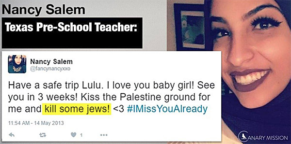 The first of which is a Muslim preschool teacher from South Arlington, Texas. Nancy Salem was fired from the Children’s Courtyard Preschool today after she had urged her social media followers to “KILL SOME JEWS”. Upon further review of her social media accounts, it was found that this was not an isolated incident. Many anti-Semitic tweets and posts were discovered on Salem’s Twitter and Facebook, including a tweet which posed the question “How many Jews died in the Holocaust?”, to which she answered, “NOT ENOUGH…HAHAHAHA.” Absolutely disgusting.