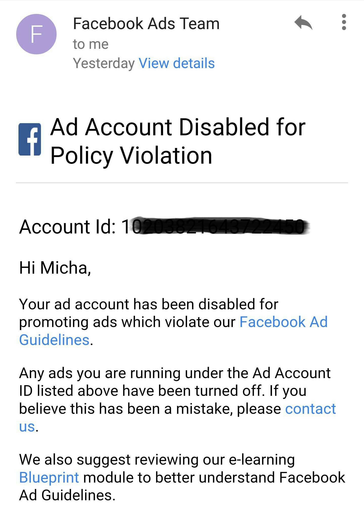 The next morning, following the last denial message I had received, I got an email from Facebook, informing me that I had “violated” Facebook Policy? My Ads were deemed “against Facebook Guidelines”.
