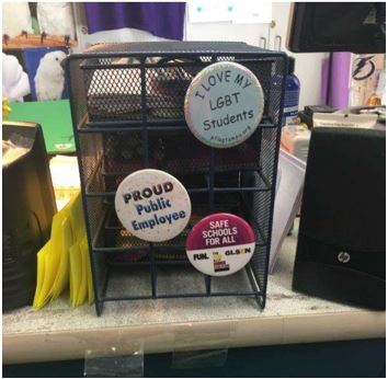 According to the Counsel, Riedas herself is a lesbian, and the School’s “Gay, Straight Alliance” sponsor. She engages in “political activism” in her classroom, which is “permanently decorated with LGBT political themes” including “buttons prominently displayed on her desk, facing students, stating ‘I Love My LGBT Students’ and ‘PROUD Public Employee’.”