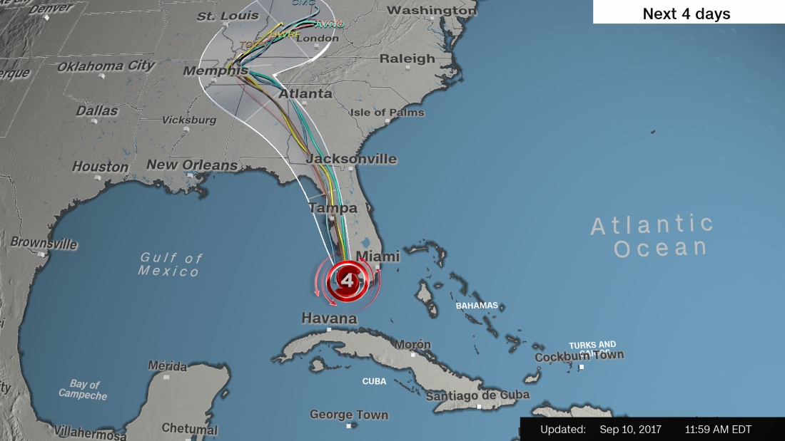 ▫ Once Irma moves back over the water of the Florida straits, some of the warmest in the world (about 90 degrees), the storm is forecast to make landfall in the U.S. as a dangerous Category 4 hurricane with up to 140 mph winds.