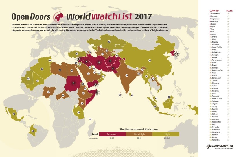 While we Christians in the U.S. and other Western nations experience a different kind of persecution, I don’t think many believers here understand what the word “persecution” truly means. Our North Korean brothers and sisters are being martyred for the Faith every single day. According to the Open Doors’ World Watch List for 2017, the top 10 nations where it is most dangerous and difficult to practice Christianity are North Korea, Somalia, Afghanistan, Pakistan, Sudan, Syria, Iraq, Iran, Yemen, and Eritrea. You can read the the full list of the 50 nations below –
