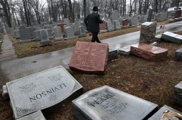 At the same time, vandals toppled and damaged headstones at Jewish Cemeteries. About 200 headstones were vandalized in Missouri, another 100 were broken in Philadelphia, and more in New York. Around 400 Jewish headstones were vandalized in the first two months of 2017.