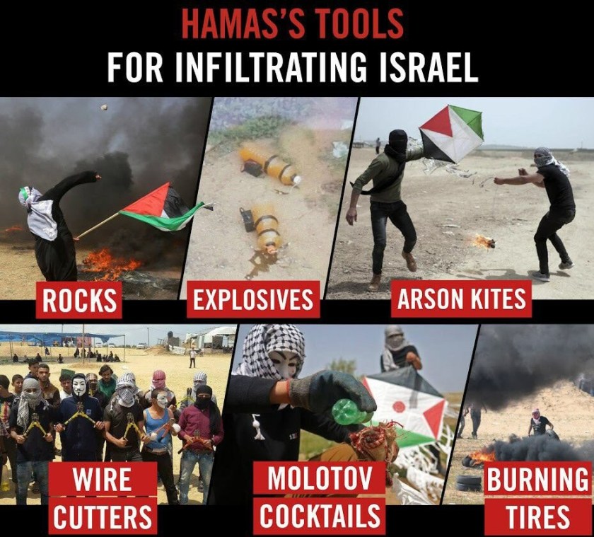 So, while you read the headlines I shared, reporting “Palestinians killed by Israeli Military” or “hundreds injured”, there are not “innocent civilians” losing their lives. Though the media doesn’t feel the need to tell you that. Here are just a few images from the so-called “peaceful protests”, and you can see that Israeli forces are not shooting innocent women and children.