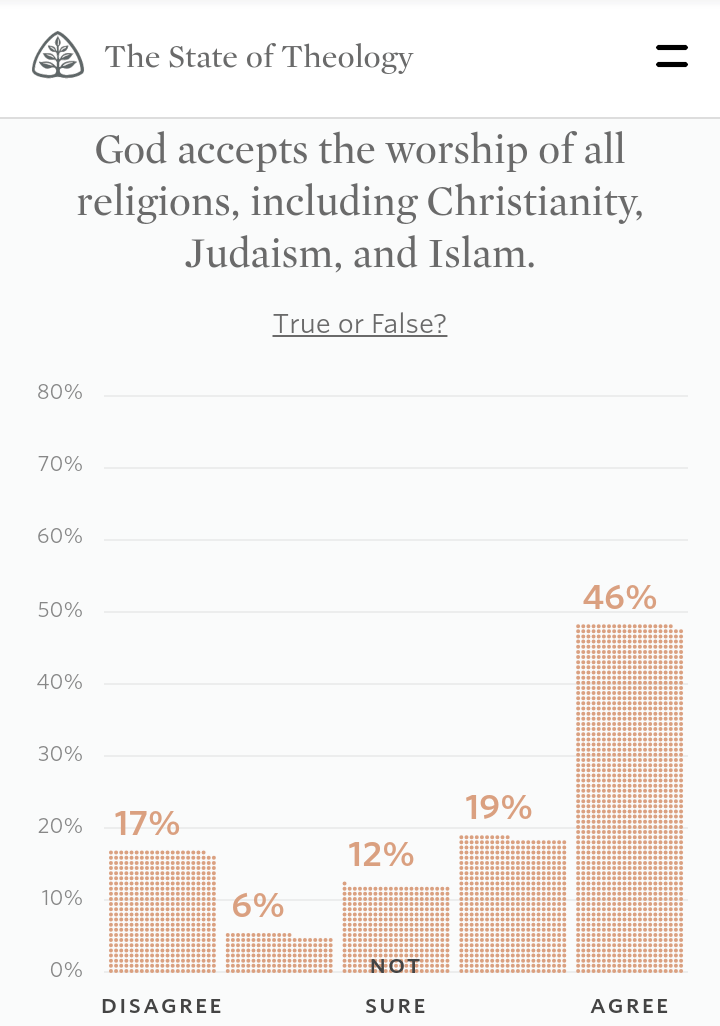 Again, more than half! I’m curious as to what version of the Holy Bible that this half of Evangelicals are reading today… or not reading at all. If they are reading their Bibles, their versions are certainly poorly translated ones. God does NOT accept worship of other “gods” or “religions,” not in any way shape or form.