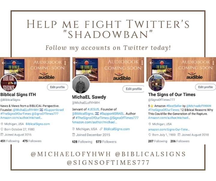 Thanks for your continued support of my books and this website always friends. Also, if you would like to help me battle my “shadowban” on Twitter, follow my accounts in the image below. Share and retweet often to counter the unjust Facebook and Twitter suppression! God bless.