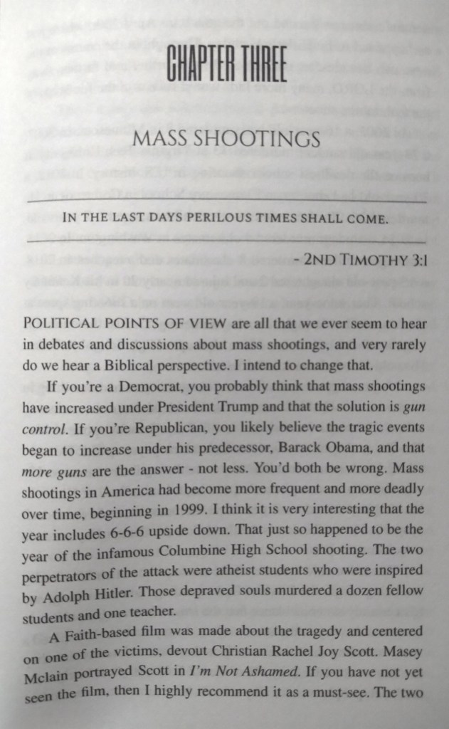 It is packed with statistics and accounts of Mass shootings in America. I give Biblical reasons for why they occur, as well as Biblical prescriptions for how to stop them in the future. So enjoy reading this week’s preview from the chapter titled “Mass Shootings”…