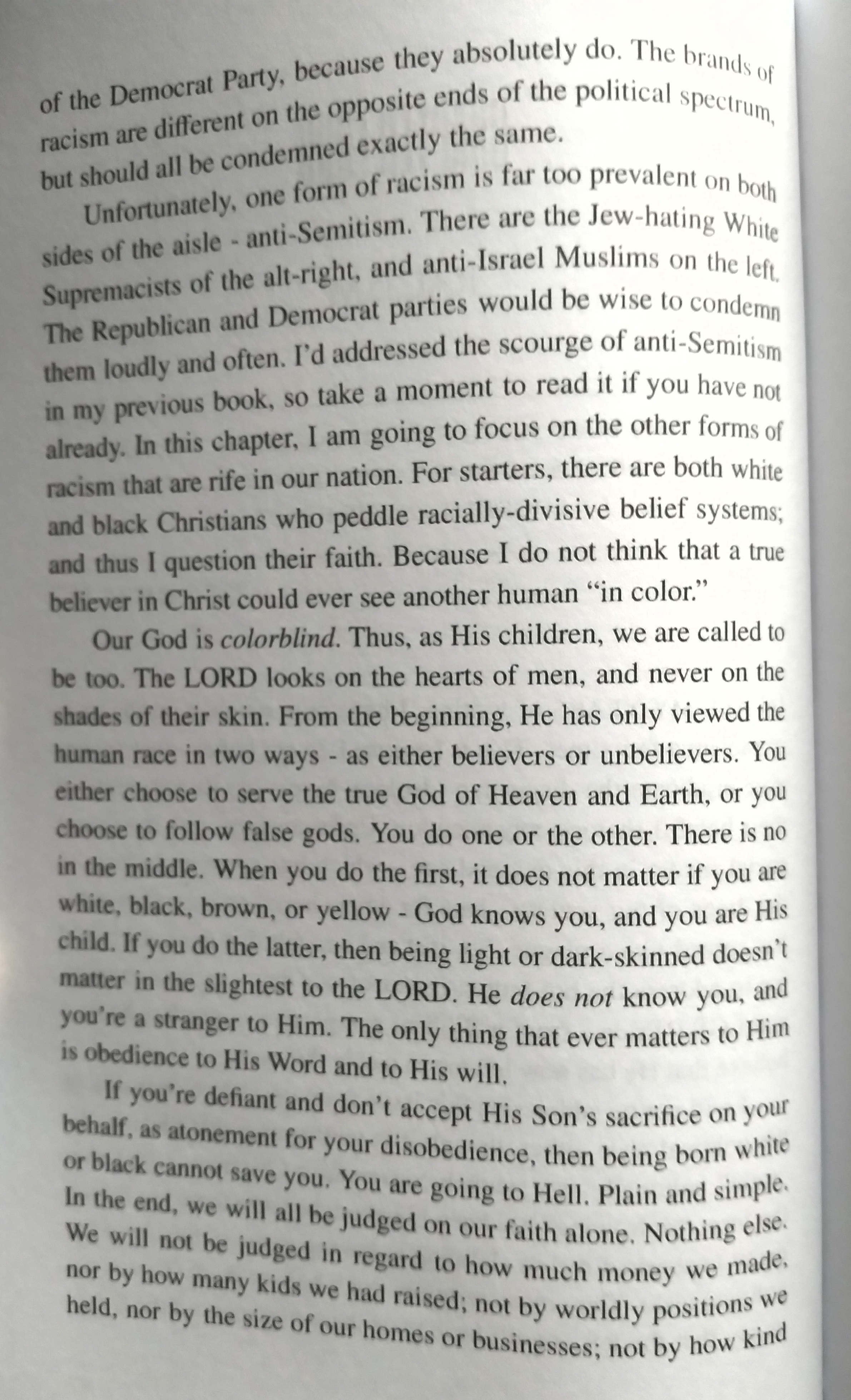 As I wrote in the book, when we are “in Christ,” we are all equal in God’s Sight. I am not any more favored by the Lord than an African believer, Jewish believer, Arab believer, Spanish believer, or Asian believer. We are all “one race” in Christ Jesus. We’re all one family. We’re all members of the Church, regardless of denomination. We are all members of one body, of which He is “the Head” (Romans 12:4-5, 1st Corinthians 10:16-17 and 12:12, Ephesians 1:22 – 2:19-22 – 4:15-16 – 5:23, and Colossians 1:18).