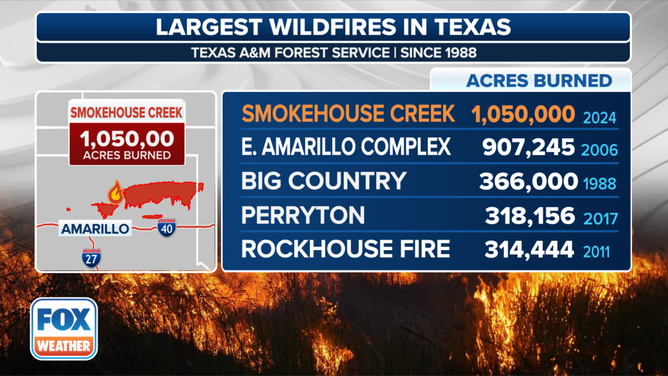 FOXWeather reports: A massive wildfire that has exploded to more than 1 million acres of land in just four days in the Texas Panhandle has now become the largest wildfire in state history as firefighters continue their desperate attempts to contain the blaze.