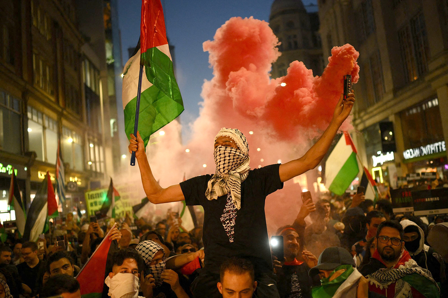 Campaign Against Antisemitism, a UK-based antisemitism NGO, has repeatedly filmed individual protesters at the demonstrations openly supporting the terror group.